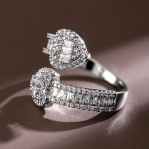 Ring : This rhodium-plated adjustable ring features a sophisticated double buckle design, intricately studded with cubic zirconia, exuding modern elegance and a luxurious appeal. Occasion : Bring your style to a whole new level with this handcrafted piece of jewellery. When you’re celebrating a special Occasion : – a birthday, wedding, or personal milestone – this piece adds that extra something that makes us feel special and looking our best. Material : & Care Dimension : Net Weight: 4.27 g Net Quantity : 1 Ring Material :Brass Care Label : It is advisable to avoid contact with water and organic chemicals i.e. perfume sprays. Store jewellery in airtight box. After use, wipe the jewellery with soft cotton cloth.