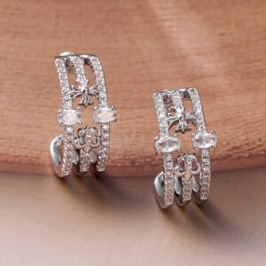 Earrings : These huggie hoop earrings are Rhodium plated and beautifully adorned with Cubic Zirconia, featuring an elegant floral design with sparkling accents. The triple-layer structure adds depth and dimension, making them a versatile addition to any jewelry collection. Occasion : Bring your style to a whole new level with this handcrafted piece of jewellery. When you’re celebrating a special Occasion : – a birthday, wedding, or personal milestone – this piece adds that extra something that makes us feel special and looking our best. Material : & Care Dimension : Size : Length : 2.5 cm, Width : 1.5 cm Material :Brass Care Label : It is advisable to avoid contact with water and organic chemicals i.e. perfume sprays. Store jewellery in airtight box. After use, wipe the jewellery with soft cotton cloth.