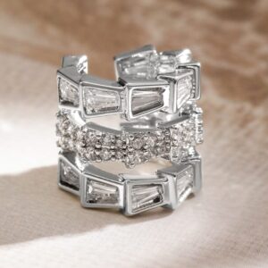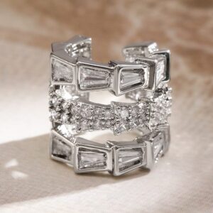 Ear Cuff: Enhance your look with these rhodium-plated ear cuff earrings featuring a modern geometric design adorned with cubic zirconia. The openable feature ensures easy wear and a snug fit, perfect for making a statement. Occasion : Bring your style to a whole new level with this handcrafted piece of jewellery. When you’re celebrating a special Occasion : – a birthday, wedding, or personal milestone – this piece adds that extra something that makes us feel special and looking our best. Material : & Care Dimension : Length : 1.5 cm, Width: 1.5 cm Net Weight: 5.80 g Net Quantity : 1 Piece of Ear Cuff Material : Brass Care Label : It is advisable to avoid contact with water and organic chemicals i.e. perfume sprays. Store jewellery in airtight box. After use, wipe the jewellery with soft cotton cloth.