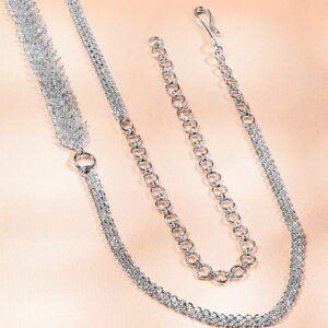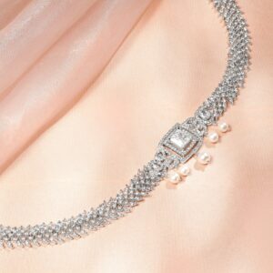 Saree Accessories : This rhodium-plated kamarbandh features a central square-cut cubic zirconia with delicate white pearls and shimmering accents. A luxurious waist belt for women & girls, ideal for festive and wedding styling. Occasion : Bring your style to a whole new level with this handcrafted piece of jewellery. When you’re celebrating a special Occasion : – wedding, festive or personal milestone – this piece adds that extra something that makes us feel special and looking our best. Material & Care Dimension : Length : 48 cm, Width: 3 cm Plating : Rhodium Plated Net Weight: 52.37 Gram Net Quantity : 1 Saree Accessories Material : Brass Care Label : It is advisable to avoid contact with water and organic chemicals i.e. perfume sprays. Store jewellery in airtight box. After use, wipe the jewellery with soft cotton cloth.