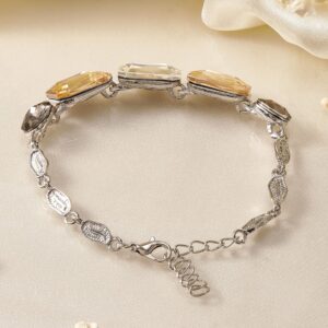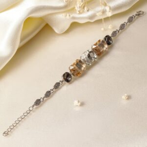 Bracelet : Discover the elegance of Rhodium Plated Cubic Zirconia Studded Multi-Colored Statement Bracelet. This piece combines quality craftsmanship with a timeless design, making it perfect for any occasion. Elevate your style effortlessly and enjoy compliments on your refined taste. A must-have addition to your jewelry collection. Occasion : Bring your style to a whole new level with this handcrafted piece of jewellery. When you’re celebrating a special Occasion : – a birthday, wedding, or personal milestone – this piece adds that extra something that makes us feel special and looking our best. Material : & Care Dimension : Bracelet Size: M/L Material :Brass Care Label : It is advisable to avoid contact with water and organic chemicals i.e. perfume sprays. Store jewellery in airtight box. After use, wipe the jewellery with soft cotton cloth.