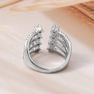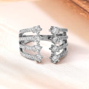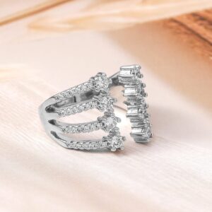 Ring : This exquisite finger ring features a unique open-cage design, intricately studded with sparkling Cubic Zirconia stones. The rhodium plating adds a touch of elegance, while the adjustable band ensures a perfect fit, making it a stylish and sophisticated addition to any jewelry collection. Occasion : Bring your style to a whole new level with this handcrafted piece of jewellery. When you’re celebrating a special Occasion : – a birthday, wedding, or personal milestone – this piece adds that extra something that makes us feel special and looking our best. Material : & Care Dimension : Size : Length : 7 cm, Width : 1. 5 cm Material :Brass Care Label : It is advisable to avoid contact with water and organic chemicals i.e. perfume sprays. Store jewellery in airtight box. After use, wipe the jewellery with soft cotton cloth.