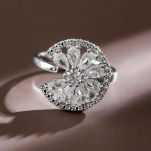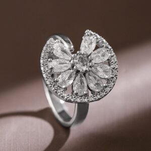 Ring : This exquisite rhodium-plated openable adjustable ring showcases a half-moon floral design, adorned with sparkling cubic zirconia stones. The petal-like marquise-cut stones create a blooming effect, adding elegance to any look. Occasion : Bring your style to a whole new level with this handcrafted piece of jewellery. When you’re celebrating a special Occasion : – a birthday, wedding, or personal milestone – this piece adds that extra something that makes us feel special and looking our best. Material : & Care Dimension : Net Weight: 4.23 g Net Quantity : 1 Ring Material :Brass Care Label : It is advisable to avoid contact with water and organic chemicals i.e. perfume sprays. Store jewellery in airtight box. After use, wipe the jewellery with soft cotton cloth.
