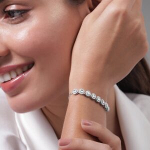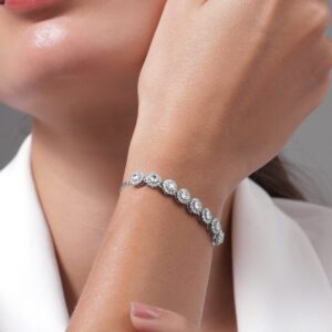 Bracelet : This stunning bracelet is rhodium-plated and features a row of intricately studded round cubic zirconia stones. The adjustable chain ensures a comfortable fit, adding a touch of sparkle to any attire. Occasion : Bring your style to a whole new level with this handcrafted piece of jewellery. When you’re celebrating a special Occasion : – a birthday, wedding, or personal milestone – this piece adds that extra something that makes us feel special and looking our best. Material : & Care Dimension : Size : Length : 13 cm, Width : 0.5 cm Material :Brass Care Label : It is advisable to avoid contact with water and organic chemicals i.e. perfume sprays. Store jewellery in airtight box. After use, wipe the jewellery with soft cotton cloth.