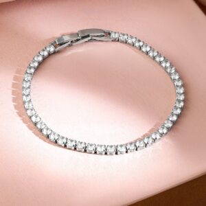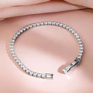 Bracelet :Elevate your elegance with this exquisite rhodium-plated premium tennis bracelet, featuring dazzling cubic zirconia stones in a bezel and prong setting. Designed for timeless sophistication, this bracelet is perfect for both everyday luxury and special occasions. Occasion : Bring your style to a whole new level with this handcrafted piece of jewellery. When you’re celebrating a special Occasion : – a birthday, wedding, or personal milestone – this piece adds that extra something that makes us feel special and looking our best. Material : & Care Dimension : Length : 18 cm, Width: 0.3 cm Net Weight: 5.40g Net Quantity : 1 Bracelet Material :Brass Care Label : It is advisable to avoid contact with water and organic chemicals i.e. perfume sprays. Store jewellery in airtight box. After use, wipe the jewellery with soft cotton cloth.