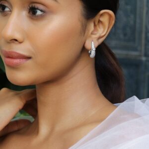 Earrings : Add a touch of luxury with these rhodium-plated mini hoop earrings. Featuring brilliant cubic zirconia embellishments and a sleek design, these earrings make a stylish statement. Occasion : Bring your style to a whole new level with this handcrafted piece of jewellery. When you’re celebrating a special Occasion : – a birthday, wedding, or personal milestone – this piece adds that extra something that makes us feel special and looking our best. Material : & Care Dimension : Length : 2.3 cm, Width: 0.7 cm Net Weight: 7.22 g Net Quantity : 1 Pair Of Earrings Material :Brass Care Label : It is advisable to avoid contact with water and organic chemicals i.e. perfume sprays. Store jewellery in airtight box. After use, wipe the jewellery with soft cotton cloth.