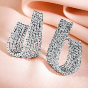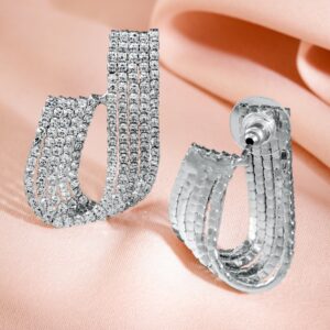 Earrings : These Rhodium-Plated Curved Crystal Statement Stud Earrings feature a sleek, curved design embellished with sparkling crystals. The rhodium-plated setting adds a touch of elegance, perfect for a bold, refined look. Occasion : Bring your style to a whole new level with this handcrafted piece of jewellery. When you’re celebrating a special Occasion : – a birthday, wedding, or personal milestone – this piece adds that extra something that makes us feel special and looking our best. Material : & Care Dimension : Length : 3.5 cm, Width: 2.3 cm Net Weight: 11.49 g Net Quantity : 1 Pair Of Earrings Material :Brass Care Label : It is advisable to avoid contact with water and organic chemicals i.e. perfume sprays. Store jewellery in airtight box. After use, wipe the jewellery with soft cotton cloth.