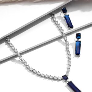 Jewellery Set : This Rhodium-plated premium necklace set features , beautifully complemented by CZ Studded Teardrop. The elegant design, paired with matching earrings, makes this set a perfect choice for adding a touch of luxury and sophistication to any special occasion. Occasion : Bring your style to a whole new level with this handcrafted piece of jewellery. When you’re celebrating a special Occasion : – a birthday, wedding, or personal milestone – this piece adds that extra something that makes us feel special and looking our best. Material : & Care Dimension : Size : Necklace : 17 cm, Earrings : 4 cm Material :Brass Care Label : It is advisable to avoid contact with water and organic chemicals i.e. perfume sprays. Store jewellery in airtight box. After use, wipe the jewellery with soft cotton cloth.