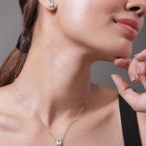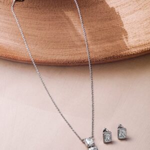 Jewellery Set : This 18K gold-plated necklace set features a sleek square pendant, elegantly studded with Cubic Zirconia stones, paired with matching earrings. The minimalist design and sparkling accents make this set a perfect choice for adding subtle sophistication to any ensemble. Occasion : Bring your style to a whole new level with this handcrafted piece of jewellery. When you’re celebrating a special Occasion : – a birthday, wedding, or personal milestone – this piece adds that extra something that makes us feel special and looking our best. Material : & Care Dimension : Size : Necklace : 42 cm, Earrings : 1 cm Material :Brass Care Label : It is advisable to avoid contact with water and organic chemicals i.e. perfume sprays. Store jewellery in airtight box. After use, wipe the jewellery with soft cotton cloth.