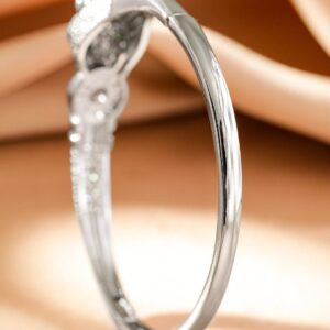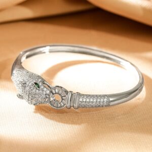 Bracelet :Make a bold statement with this rhodium-plated demi-fine openable bracelet, featuring a panther head design encrusted with cubic zirconia and emerald-green accents for a fierce yet elegant appeal. Occasion : Bring your style to a whole new level with this handcrafted piece of jewellery. When you’re celebrating a special Occasion : – a birthday, wedding, or personal milestone – this piece adds that extra something that makes us feel special and looking our best. Material : & Care Dimension : Length : 6.5 cm, Width: 1.3 cm Net Weight: 15.60g Net Quantity : 1 Bracelet Material :Brass Care Label : It is advisable to avoid contact with water and organic chemicals i.e. perfume sprays. Store jewellery in airtight box. After use, wipe the jewellery with soft cotton cloth.