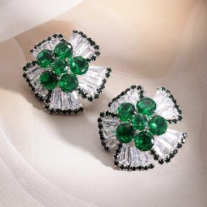 Earrings : These Rhodium-Plated Emerald and Crystal Floral Stud Earrings feature a delicate floral design with vibrant emerald and sparkling crystal accents. The rhodium-plated setting enhances their elegance, perfect for adding a touch of color and sophistication. Occasion : Bring your style to a whole new level with this handcrafted piece of jewellery. When you’re celebrating a special Occasion : – a birthday, wedding, or personal milestone – this piece adds that extra something that makes us feel special and looking our best. Material : & Care Dimension : Length : 2.7 cm, Width: 2.7 cm Net Weight: 19.19g Net Quantity : 1 Pair Of Earrings Material :Brass Care Label : It is advisable to avoid contact with water and organic chemicals i.e. perfume sprays. Store jewellery in airtight box. After use, wipe the jewellery with soft cotton cloth.