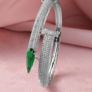 Bracelet : Elevate your style with this exquisite rhodium-plated bangle style bracelet, featuring a stunning marquise-cut emerald centerpiece. The sleek, contemporary design is enhanced by rows of sparkling cubic zirconia, creating a dazzling effect that complements the vibrant green stone. Perfect for adding a touch of elegance to any ensemble, this bracelet is a versatile accessory for both formal and casual occasions. Occasion : Bring your style to a whole new level with this handcrafted piece of jewellery. When you’re celebrating a special Occasion : – a birthday, wedding, or personal milestone – this piece adds that extra something that makes us feel special and looking our best. Material : & Care Dimension : Size : Length : 16 cm, Width : 3 cm Material :Brass Care Label : It is advisable to avoid contact with water and organic chemicals i.e. perfume sprays. Store jewellery in airtight box. After use, wipe the jewellery with soft cotton cloth.