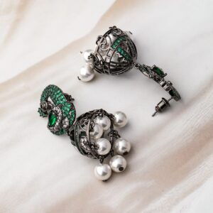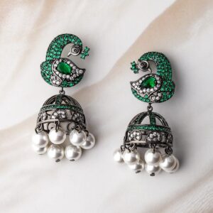 Earrings : These rhodium-plated jhumka earrings feature a captivating peacock design, Studded with emerald green AD and Cubic Zirconia stones. The intricate detailing is enhanced by elegant pearl drops, making these earrings a perfect blend of traditional charm and modern sophistication. Occasion : Bring your style to a whole new level with this handcrafted piece of jewellery. When you’re celebrating a special Occasion : – a birthday, wedding, or personal milestone – this piece adds that extra something that makes us feel special and looking our best. Material : & Care Dimension : Size : Length : 5.5 cm, Width : 2 cm Material :Brass Care Label : It is advisable to avoid contact with water and organic chemicals i.e. perfume sprays. Store jewellery in airtight box. After use, wipe the jewellery with soft cotton cloth.