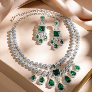 Jewellery Set : A rhodium-plated luxe statement jewellery set, adorned with emerald green stones and AAA cubic zirconia in a silver-tone finish. Ideal for weddings, grand celebrations & special occasions. Occasion : Bring your style to a whole new level with this handcrafted piece of jewellery. When you’re celebrating a special Occasion : – a birthday, wedding, festive or personal milestone – this piece adds that extra something that makes us feel special and looking our best. Material & Care Dimension : Length : Necklace : 15 cm, Earrings : 8 cm Dimension : Width : Necklace : 6 cm, Earrings : 1.5 cm Net Weight : 78.30 Gram Net Quantity : 1 Necklace & 1 Pair of Earrings Material : Brass Care Label : It is advisable to avoid contact with water and organic chemicals i.e. perfume sprays. Store jewellery in airtight box. After use, wipe the jewellery with soft cotton cloth.