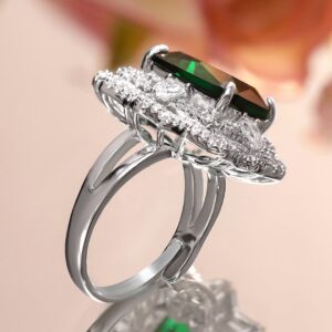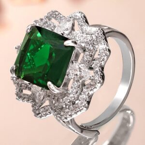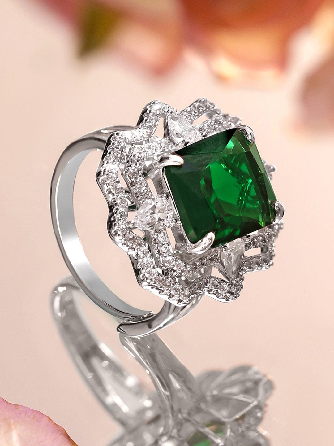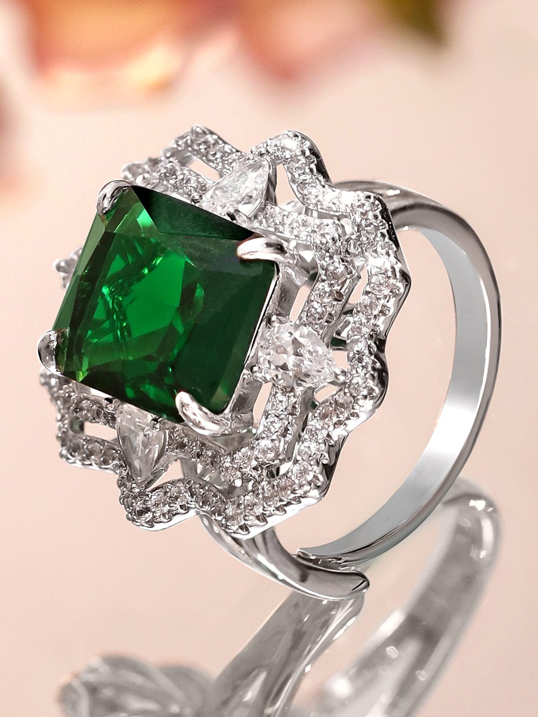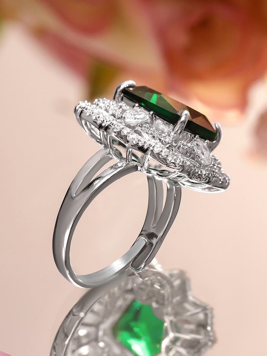Ring : This luxurious rhodium-plated ring features a bold emerald green centre stone, framed with dazzling white Cubic Zirconia in a floral pattern, perfect for festive, party or wedding looks. Occasion-Ready Elegance: Ideal for weddings, festive occasions, cocktail parties, and glamorous evenings. Material : & Care Dimension : Adjustable Ring Net Weight: 35 Gram Net Quantity : 1 Ring Material : Brass Care Label : It is advisable to avoid contact with water and organic chemicals i.e. perfume sprays. Store jewellery in airtight box. After use, wipe the jewellery with soft cotton cloth.