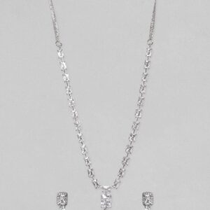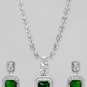Jewellery Set : This exquisite rhodium-plated necklace set is a true embodiment of luxury and elegance. Featuring a stunning central emerald green stone, framed by sparkling cubic zirconia, this set includes a matching pair of earrings, each echoing the vibrant green centerpiece. The necklace is adorned with alternating cubic zirconia stones, adding a touch of brilliance to the overall design. Perfect for adding a sophisticated flair to any ensemble, this set is a timeless addition to your jewelry collection, ensuring you stand out with grace and style. Occasion : Bring your style to a whole new level with this handcrafted piece of jewellery. When you’re celebrating a special Occasion : – a birthday, wedding, or personal milestone – this piece adds that extra something that makes us feel special and looking our best. Material : & Care Dimension : Size : Length : 21 cm, Width : 3,.5 cm Material: Brass Net Weight: 86 Gram Net Quantity: 1 Necklace & 1 Pair of Earrings Care Label: It is advisable to avoid contact with water and organic chemicals i.e. perfume sprays. Store jewellery in airtight box. After use, wipe the jewellery with soft cotton cloth.