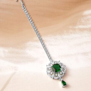 Head Jewellery : This rhodium-plated maang tikka is studded with emerald green stones and sparkling cubic zirconia, offering an elegant and timeless look that beautifully complements traditional attire. Occasion : Bring your style to a whole new level with this handcrafted piece of jewellery. When you’re celebrating a special Occasion : – a birthday, wedding, or personal milestone – this piece adds that extra something that makes us feel special and looking our best. Material : & Care Dimension : Length : 11.5 cm, Width: 1.4 cm Net Weight: 4.45 g Net Quantity : 1 Head Jewellery Material :Alloy Care Label : It is advisable to avoid contact with water and organic chemicals i.e. perfume sprays. Store jewellery in airtight box. After use, wipe the jewellery with soft cotton cloth.