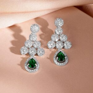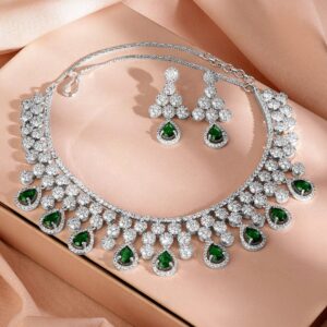 Jewelry Set : This rhodium-plated necklace set features stunning emerald green stones and sparkling cubic zirconia, paired with matching earrings for a luxurious and elegant statement Occasion : Bring your style to a whole new level with this handcrafted piece of jewellery. When you’re celebrating a special Occasion : – a birthday, wedding, festive or personal milestone – this piece adds that extra something that makes us feel special and looking our best. Material & Care Dimension : Length : 25 cm / 3 cm, Width: 4 cm / 2.5 cm Material :Brass Net Quantity : 1 Necklace & 1 Pair of Earrings Weight : 52.78 Gram Care Label : It is advisable to avoid contact with water and organic chemicals i.e. perfume sprays. Store jewellery in airtight box. After use, wipe the jewellery with soft cotton cloth.