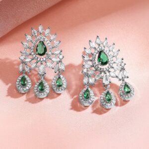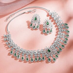 Dazzle in this rhodium-plated chandelier necklace set, adorned with emerald green & white cubic zirconia stones. Featuring an intricate cascading design, perfect for wedding, reception, festive & special occasions. Occasion : Bring your style to a whole new level with this handcrafted piece of jewellery. When you’re celebrating a special Occasion : – a birthday, wedding, festive or personal milestone – this piece adds that extra something that makes us feel special and looking our best. Material : & Care Dimension : Length : Neckace : 13 cm, Earrings : 3.5 cm Net Weight: 110 g Net Quantity : 1 Necklace & 2 Earrings Material : Brass Care Label : It is advisable to avoid contact with water and organic chemicals i.e. perfume sprays. Store jewellery in airtight box. After use, wipe the jewellery with soft cotton cloth.
