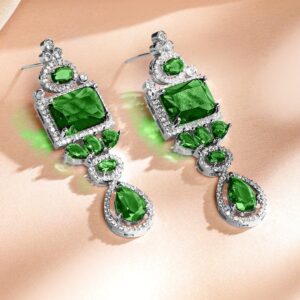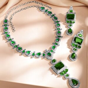 Necklace Set : A regal jewellery set adorned with emerald green stones in pear and emerald cuts, encircled by shimmering white cubic zirconia. The rhodium-plated finish enhances its brilliance, making it a timeless statement piece. Occasion : Bring your style to a whole new level with this handcrafted piece of jewellery. When you’re celebrating a special Occasion : – a birthday, wedding, or personal milestone – this piece adds that extra something that makes us feel special and looking our best. Material : & Care Dimension : Size : Neckace : 42 cm, Earrings : 2 cm Net Quantity : 1 Necklace & 2 Earrings Net Weight: 72. g Material :Brass Care Label : It is advisable to avoid contact with water and organic chemicals i.e. perfume sprays. Store jewellery in airtight box. After use, wipe the jewellery with soft cotton cloth.