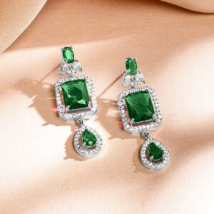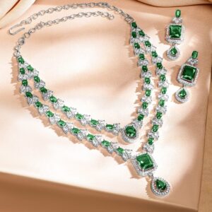 Adorn yourself with this rhodium-plated luxe necklace set, designed with emerald green & white cubic zirconia in an elegant double-layered silhouette, perfect for grand celebrations & soirées. Occasion : Bring your style to a whole new level with this handcrafted piece of jewellery. When you’re celebrating a special Occasion : – a birthday, wedding, festive or personal milestone – this piece adds that extra something that makes us feel special and looking our best. Material : & Care Dimension : Length : Neckace : 17 cm, Earrings : 1.5 cm Net Weight: 100 g Net Quantity : 1 Necklace & 1 Pair of Earrings Material : Brass Care Label : It is advisable to avoid contact with water and organic chemicals i.e. perfume sprays. Store jewellery in airtight box. After use, wipe the jewellery with soft cotton cloth.