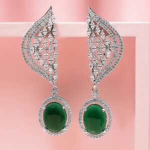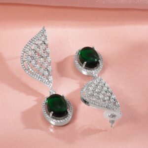 Drop Earrings : rhodium-plated drop earrings featuring oval emerald green stones and white cubic zirconia, crafted in a layered wing-style design. Ideal for women to elevate party and special occasion looks. Occasion : Bring your style to a whole new level with this handcrafted piece of jewellery. When you’re celebrating a special Occasion : – a birthday, wedding, festives or personal milestone – this piece adds that extra something that makes us feel special and looking our best. Material & Care Dimension : Length : 7 cm ; Width : 2.5 cm Net Weight : 32 gram Plating : Rhodium Plated Material : Brass Collection : AD and Cubic Zirconia Net Quantity : 1 Pair of Earrings Care Label : It is advisable to avoid contact with water and organic chemicals i.e. perfume sprays. Store jewellery in airtight box. After use, wipe the jewellery with soft cotton cloth.