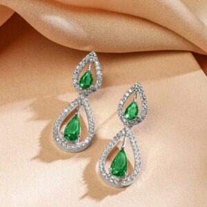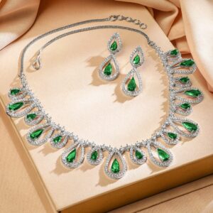 Jewellery Set : Rhodium-Plated necklace set adorned with emerald green teardrop stones and white cubic zirconia. A radiant, luxurious design perfect for festive occasions, weddings, and elegant events. Occasion : Bring your style to a whole new level with this handcrafted piece of jewellery. When you’re celebrating a special Occasion : – a birthday, wedding, parties or personal milestone – this piece adds that extra something that makes us feel special and looking our best. Material & Care Dimension : Necklace Size : 20 cm / 3.6 cm, Earrings Size : 2 cm / 1.3 cm Plating : Rhodium Plated Material :Brass Net Weight : 29.26 Gram Net Quantity : 1 Necklace & 1 Pair of Earrings Care Label : It is advisable to avoid contact with water and organic chemicals i.e. perfume sprays. Store jewellery in airtight box. After use, wipe the jewellery with soft cotton cloth.