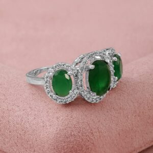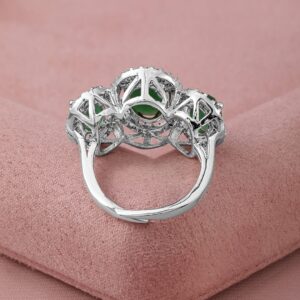 This rhodium-plated adjustable ring features three stunning emerald green stones surrounded by sparkling cubic zirconia. A statement piece, perfect for adding elegance to any outfit. Material: Wipe with a clean, dry cloth to remove dust Size : 8