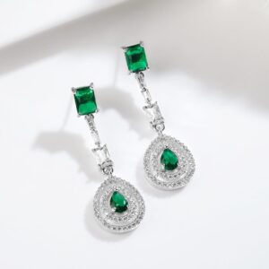 Jewellery Set : introduces a rhodium-plated necklace set featuring vibrant emerald green teardrop stones, beautifully framed by clear AD and cubic zirconia. The necklace is elegantly designed with a combination of square and baguette-cut stones leading to the striking green teardrop pendant. The matching earrings mirror the necklace€™s design, offering a complete and sophisticated look. Occasion : Bring your style to a whole new level with this handcrafted piece of jewellery. When you’re celebrating a special Occasion : – a birthday, wedding, or personal milestone – this piece adds that extra something that makes us feel special and looking our best. Material : & Care Dimension : Size : Necklace : 25 cm, Earrings : 5 cm Material: Brass Net Weight: 26.2 Gram Net Quantity: 1 Necklace & 1 Pair of Earrings Care Label: It is advisable to avoid contact with water and organic chemicals i.e. perfume sprays. Store jewellery in airtight box. After use, wipe the jewellery with soft cotton cloth.