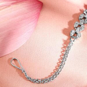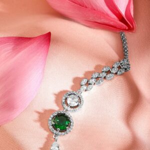 Head Jewellery : This emerald and white cubic zircon maang tikka, with rhodium plating, radiates charm and sophistication. Occasion : Bring your style to a whole new level with this handcrafted piece of jewellery. When you’re celebrating a special Occasion : – a birthday, wedding, or personal milestone – this piece adds that extra something that makes us feel special and looking our best. Material : & Care Dimension : Length : 12.5 cm, Width: 1.5 cm Net Quantity : 1 Maang Tikka Net Weight: 7.11 g Material :Brass Care Label : It is advisable to avoid contact with water and organic chemicals i.e. perfume sprays. Store jewellery in airtight box. After use, wipe the jewellery with soft cotton cloth.