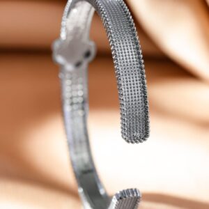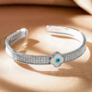 Bracelet :Embrace elegance and protection with this Rhodium-Plated Evil Eye Cuff Bracelet. Featuring cubic zirconia detailing and an evil eye centerpiece, this bracelet offers a perfect blend of style and symbolism. Occasion : Bring your style to a whole new level with this handcrafted piece of jewellery. When you’re celebrating a special Occasion : – a birthday, wedding, or personal milestone – this piece adds that extra something that makes us feel special and looking our best. Material : & Care Dimension : Length : 6 cm, Width: 1.1 cm Net Weight: 13.30g Net Quantity : 1 Bracelet Material :Brass Care Label : It is advisable to avoid contact with water and organic chemicals i.e. perfume sprays. Store jewellery in airtight box. After use, wipe the jewellery with soft cotton cloth.