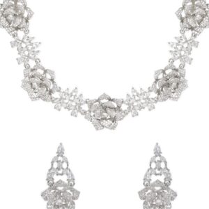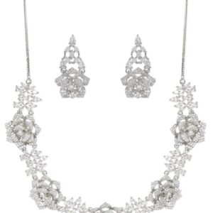 The intricately designed set exudes a captivating splendor, perfect for elevating your style. Embrace the allure of this set, allowing the pave AD stones to shimmer gracefully. Let the rhodium plating and intricate craftsmanship create an air of timeless charm and exquisite allure, making a statement of refined beauty and luxurious charm. Material & Care Dimension : Necklace : 18 cm Earrings : 3 cm Material: Brass Net Weight: 56.15 Gram Net Quantity: 1 Necklace & 1 Pair of Earrings Care Label: It is advisable to avoid contact with water and organic chemicals i.e. perfume sprays. Store jewellery in airtight box. After use, wipe the jewellery with soft cotton cloth.