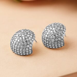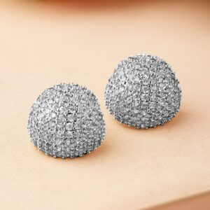 Earrings : Add timeless elegance to your look with ‘ rhodium-plated dome-shaped earrings, fully encrusted with shimmering cubic zirconia stones. A bold yet sophisticated statement piece for your jewelry collection. Occasion : Bring your style to a whole new level with this handcrafted piece of jewellery. When you’re celebrating a special Occasion : – a birthday, wedding, or personal milestone – this piece adds that extra something that makes us feel special and looking our best. Material : & Care Dimension : Length : 1.8 cm, Width: 1.5 w Net Weight: 6.86 g Net Quantity : 1 Pair Of Earrings Material :Brass Care Label : It is advisable to avoid contact with water and organic chemicals i.e. perfume sprays. Store jewellery in airtight box. After use, wipe the jewellery with soft cotton cloth.