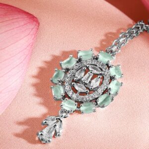 Head Jewellery : Beautiful green and white cubic zircon maang tikka with rhodium plating, perfect for festive and bridal wear. Occasion : Bring your style to a whole new level with this handcrafted piece of jewellery. When you’re celebrating a special Occasion : – a birthday, wedding, or personal milestone – this piece adds that extra something that makes us feel special and looking our best. Material : & Care Dimension : Length : 12 cm, Width: 1.5 cm Net Quantity : 1 Maang Tikka Net Weight: 4.60 g Material :Brass Care Label : It is advisable to avoid contact with water and organic chemicals i.e. perfume sprays. Store jewellery in airtight box. After use, wipe the jewellery with soft cotton cloth.