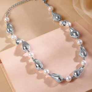 Necklace and Chains : A stunning fusion of modern and classic, this necklace features uniquely sculpted silver-toned beads interspersed with lustrous pearls. The fluid, organic shapes add a contemporary touch, while the pearls exude timeless grace. Perfect for those who appreciate bold sophistication with a hint of avant-garde charm. Occasion : Bring your style to a whole new level with this handcrafted piece of jewellery. When you’re celebrating a special Occasion : – a birthday, wedding, or personal milestone – this piece adds that extra something that makes us feel special and looking our best. Material : & Care Dimension : Size : Length : 30 cm, Width: 1 cm Net Weight: 40 g Net Quantity : 1 Necklace Material : Care Label : It is advisable to avoid contact with water and organic chemicals i.e. perfume sprays. Store jewellery in airtight box. After use, wipe the jewellery with soft cotton cloth.