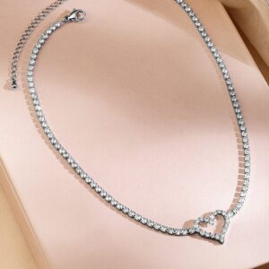 Necklace and Chains : Celebrate elegance with Rhodium-Plated Tennis Necklace featuring a stunning heart-shaped pendant studded with sparkling cubic zirconia, perfect for a dazzling statement look. Occasion : Bring your style to a whole new level with this handcrafted piece of jewellery. When you’re celebrating a special Occasion : – a birthday, festive, Parties or personal milestone – this piece adds that extra something that makes us feel special and looking our best. Material & Care Dimension : Necklace & Chain – Length Size : 15 cm Necklace & Chain – Width Size : 1.5 cm Weight : 6.70 g Material :Brass Net Quantity : 1 Necklace Care Label : It is advisable to avoid contact with water and organic chemicals i.e. perfume sprays. Store jewellery in airtight box. After use, wipe the jewellery with soft cotton cloth.