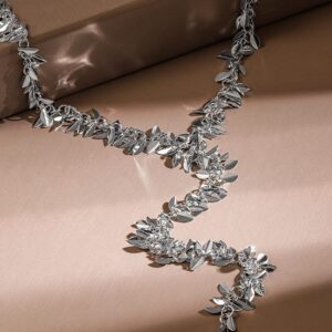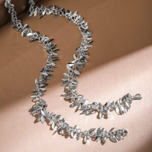 Necklace and Chains : Add a touch of sophistication with this stunning silver leaf drop necklace. Featuring delicately arranged metallic leaves that create a cascading effect, this piece exudes elegance and grace. Perfect for both formal occasions and everyday wear, this versatile necklace is a must-have in any jewelry collection. Occasion : Bring your style to a whole new level with this handcrafted piece of jewellery. When you’re celebrating a special Occasion : – a birthday, wedding, or personal milestone – this piece adds that extra something that makes us feel special and looking our best. Material : & Care Dimension : Size : Length : 30 cm, Width: 1 cm Net Weight: 30g Net Quantity : 1 Necklace Material : Care Label : It is advisable to avoid contact with water and organic chemicals i.e. perfume sprays. Store jewellery in airtight box. After use, wipe the jewellery with soft cotton cloth.
