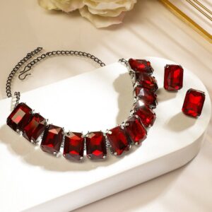 Jewellery Set : This rhodium-plated statement choker set features deep maroon crystal cubic zirconia stones, set in a modern and elegant design. The matching stud earrings complete the luxurious and stylish look Occasion : Bring your style to a whole new level with this handcrafted piece of jewellery. When you’re celebrating a special Occasion : – a birthday, wedding, or personal milestone – this piece adds that extra something that makes us feel special and looking our best. Material : & Care Dimension : Size : Necklace : 16 cm, Earrings : 1.5 cm Net Quantity : 1 Necklace & 2 Earrings Net Weight: 39.63 g Material :Brass Care Label : It is advisable to avoid contact with water and organic chemicals i.e. perfume sprays. Store jewellery in airtight box. After use, wipe the jewellery with soft cotton cloth.