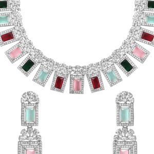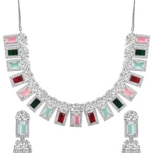 Jewellery Set : Discover the elegance of Rhodium-Plated Multicolor Gemstone & Cubic Zirconia Studded Statement Jewellery Set. This piece combines quality craftsmanship with a timeless design, making it perfect for any occasion. Elevate your style effortlessly and enjoy compliments on your refined taste. A must-have addition to your jewelry collection. Occasion : Bring your style to a whole new level with this handcrafted piece of jewellery. When you’re celebrating a special Occasion : – a birthday, wedding, or personal milestone – this piece adds that extra something that makes us feel special and looking our best. Material : & Care Dimension : Necklace Size : 22 cm / 2.3 cm, Earrings Size : 5.5 cm / 1.6 cm Material: Brass Net Weight: 68.49 Gram Net Quantity: 1 Necklace & 1 Pair of Earrings Care Label: It is advisable to avoid contact with water and organic chemicals i.e. perfume sprays. Store jewellery in airtight box. After use, wipe the jewellery with soft cotton cloth.