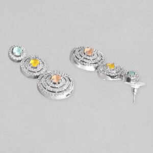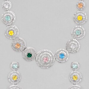 It’s a necklace set for the queens! Exude the royal vibe with rhodium plated brass, pearl, beads and stones. Occasion : Bring your style to a whole new level with this handcrafted piece of jewellery. When you’re celebrating a special Occasion : – a birthday, wedding, or personal milestone – this piece adds that extra something that makes us feel special and looking our best. Material & Care Dimension : Necklace 24 cm; Earring 4.5 cm: Material : Brass Collection : AD Care Label : It is advisable to avoid contact with water and organic chemicals i.e. perfume sprays. Store jewellery in airtight box. After use, wipe the jewellery with soft cotton cloth.