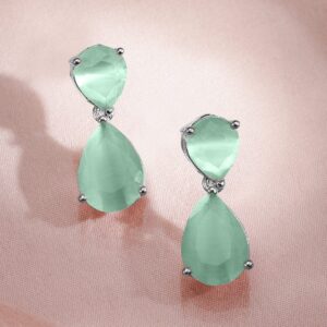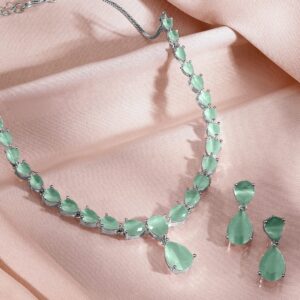 Jewellery Set : This rhodium-plated necklace set features elegant pastel green AD stones and cubic zirconia, paired with matching earrings for a luxurious and sophisticated statement look. Occasion : Bring your style to a whole new level with this handcrafted piece of jewellery. When you’re celebrating a special Occasion : – a birthday, wedding, or personal milestone – this piece adds that extra something that makes us feel special and looking our best. Material : & Care Dimension : Length : 30 cm / 2.3 cm, Width: 5 cm / 2.3 cm Net Quantity : 1 Necklace & 2 Earrings Net Weight: 25.5 g Material :Brass Care Label : It is advisable to avoid contact with water and organic chemicals i.e. perfume sprays. Store jewellery in airtight box. After use, wipe the jewellery with soft cotton cloth.