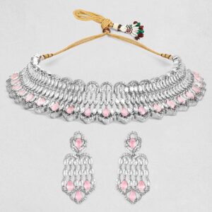 Be the first to review “Rhodium-Plated Pastel Pink AD Stone & Cubic Zirconia Studded Choker Necklace Set – Silver”