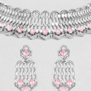 Rhodium-Plated Pastel Pink AD Stone & Cubic Zirconia Studded Choker Necklace Set – Silver