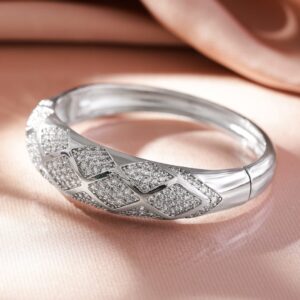Bracelet :’ Rhodium-Plated Openable Bracelet features an exquisite pave diamond-inspired pattern with shimmering cubic zirconia, offering timeless elegance and versatility for any look. Occasion : Bring your style to a whole new level with this handcrafted piece of jewellery. When you’re celebrating a special Occasion : – a birthday, wedding, or personal milestone – this piece adds that extra something that makes us feel special and looking our best. Material : & Care Dimension : Length : 6.5 cm, Width: 1.5 cm Net Weight: 44.77g Net Quantity : 1 Bracelet Material :Brass Care Label : It is advisable to avoid contact with water and organic chemicals i.e. perfume sprays. Store jewellery in airtight box. After use, wipe the jewellery with soft cotton cloth.