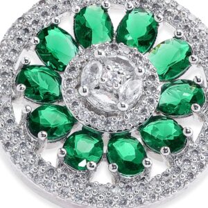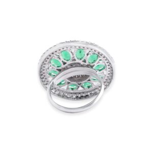 Make a bold statement with our Rhodium-Plated Pave Green Zirconia Studded Statement Ring. This exquisite ring features a captivating array of green zirconia stones set in a rhodium-plated band. The combination of rich green hues and sparkling pave stones creates a striking and glamorous accessory that will turn heads and elevate your style Occasion : Bring your style to a whole new level with this handcrafted piece of jewellery. When you’re celebrating a special Occasion : – a birthday, wedding, or personal milestone – this piece adds that extra something that makes us feel special and looking our best. Material & Care Dimension : Free Size Material : Brass Net Weight: 8.91 Gram Net Quantity: 1 Ring Care Label: It is advisable to avoid contact with water and organic chemicals i.e. perfume sprays. Store jewellery in airtight box. After use, wipe the jewellery with soft cotton cloth.
