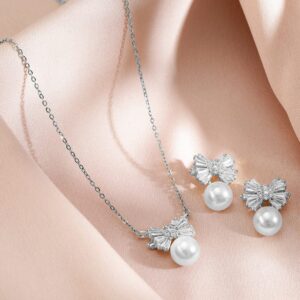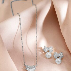 Jewellery Set : The Rhodium-Plated Pearl and Crystal Bow Necklace and Earrings set features an elegant bow design, adorned with shimmering pearls and crystals, set in rhodium-plated metal for a refined, timeless look. Occasion : Bring your style to a whole new level with this handcrafted piece of jewellery. When you’re celebrating a special Occasion : – a birthday, wedding, or personal milestone – this piece adds that extra something that makes us feel special and looking our best. Material : & Care Dimension : Size : Necklace : 20.3 cm, Earrings : 2 cm Net Weight:80g Net Quantity : 1 necklace & 2 Earrings Material : Care Label : It is advisable to avoid contact with water and organic chemicals i.e. perfume sprays. Store jewellery in airtight box. After use, wipe the jewellery with soft cotton cloth.