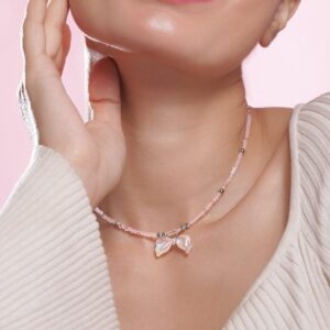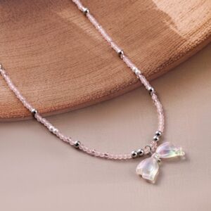 Necklace and Chains : This delicate necklace features soft pink beads complemented by a rhodium-plated chain, accented with silver-tone beads. The centerpiece is a charming iridescent butterfly bow pendant, adding a whimsical and graceful touch to your look. Perfect for a subtle yet stylish statement. Occasion : Bring your style to a whole new level with this handcrafted piece of jewellery. When you’re celebrating a special Occasion : – a birthday, wedding, or personal milestone – this piece adds that extra something that makes us feel special and looking our best. Material : & Care Dimension : Size : Length : 40 cm, Width : 2.5 cm Material :Brass Weight : 7.2g Net Qnty : 1 Necklace Care Label : It is advisable to avoid contact with water and organic chemicals i.e. perfume sprays. Store jewellery in airtight box. After use, wipe the jewellery with soft cotton cloth.