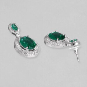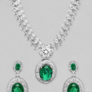It’s a necklace for the queens! Exude the royal vibe with this Stone Studded Western Chain is crafted from rhodium plated brass, zircon and stones. Occasion : Bring your style to a whole new level with this handcrafted piece of jewellery. When you’re celebrating a special Occasion : – a birthday, wedding, or personal milestone – this piece adds that extra something that makes us feel special and looking our best. Material & Care Dimension : Necklace :36 cm; Earring: 4 cm: Material : Brass Collection : AD Care Label : It is advisable to avoid contact with water and organic chemicals i.e. perfume sprays. Store jewellery in airtight box. After use, wipe the jewellery with soft cotton cloth.