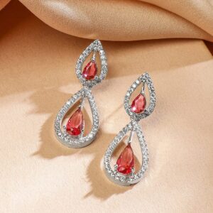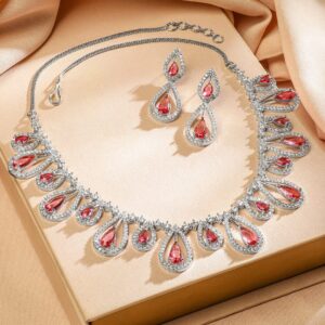 Jewellery Set : Rhodium-Plated necklace set featuring a delicate teardrop design with rosé pink stones and white cubic zirconia accents. A graceful and glamorous choice for festive and special occasion wear. Occasion : Bring your style to a whole new level with this handcrafted piece of jewellery. When you’re celebrating a special Occasion : – a birthday, wedding, parties or personal milestone – this piece adds that extra something that makes us feel special and looking our best. Material & Care Dimension : Necklace Size : 20 cm / 3.6 cm, Earrings Size : 2 cm / 1.3 cm Plating : Rhodium Plated Material :Brass Net Weight : 29.26 Gram Net Quantity : 1 Necklace & 1 Pair of Earrings Care Label : It is advisable to avoid contact with water and organic chemicals i.e. perfume sprays. Store jewellery in airtight box. After use, wipe the jewellery with soft cotton cloth.