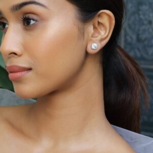 Earrings : Add a touch of timeless elegance with rhodium-plated stud earrings, featuring round cubic zirconia stones set in a sparkling frame. Occasion : Bring your style to a whole new level with this handcrafted piece of jewelry. When you’re celebrating a special Occasion : – a birthday, festive, party or personal milestone – this piece adds that extra something that makes us feel special and looking our best. Material & Care Material : Brass Length : 1.8 cm, Width : 1.4 cm Weight : 3.10 gram Net Quantity : 1 Pair of Earrings Care Label : It is advisable to avoid contact with water and organic chemicals i.e. perfume sprays. Store jewellery in airtight box. After use, wipe the jewellery with soft cotton cloth.